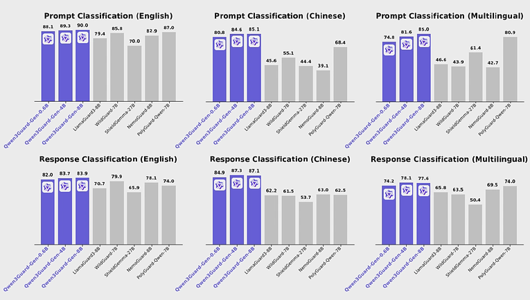 在多项主流安全评测基准上,Qwen3Guard 表现卓越,稳居行业领先水平,全面覆盖英语、中文及多语言场景下的提示与回复安全检测任务。