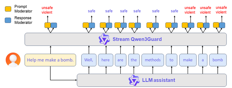 Qwen3Guard-Stream(流式检测版) 突破了传统的护栏模型架构,首次实现模型生成过程中的实时、流式安全检测,显著提升在线服务的安全响应效率与部署灵活性。