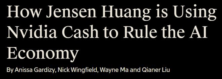 The Information形容英伟达像「AI世界的政*」(https://www.theinformation.com/articles/jensen-huang-using-nvidia-cash-rule-ai-economy),黄仁勋可能比这还多干了一点。