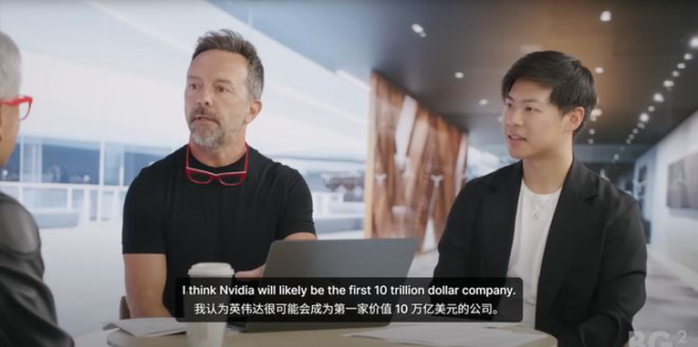 而主持人后面更是大胆预言,英伟达很可能将成为第一家市值10万亿美元的公司。