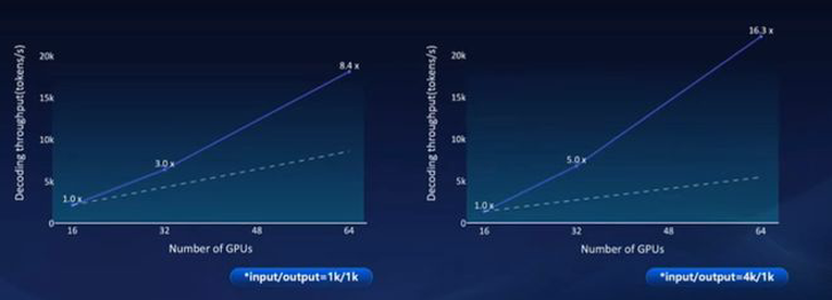 以DeepSeek R1-671B为例,从16卡扩展到64卡,实现了16.3倍超线性的扩展率!