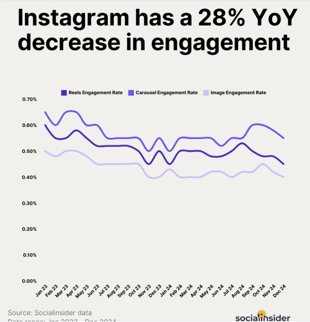 行业分析与社媒监测显示 Instagram 等平台的平均互动率在 2024–2025 年出现明显下行|图源:socialinsider