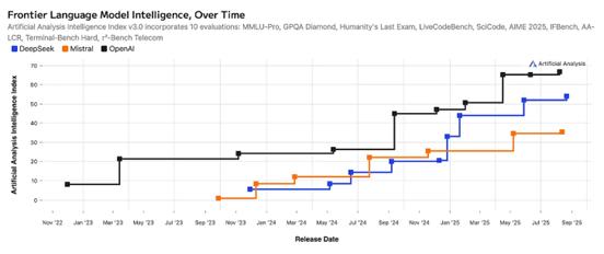 首先,Mistral AI虽然是目前估值最高的大模型独角兽之一,但他们的产品在市场中并不受欢迎——阿姆斯特丹大学近期发布了一份调查报告显示Mistral在整个大模型赛道内的市场份额只有2%,在2025年1月之后快速地Deepseek和OpenAI拉开差距——这意味着Mistral无论是在产品差异上还是使用体验上,都没有拿出具有说服力的表现。