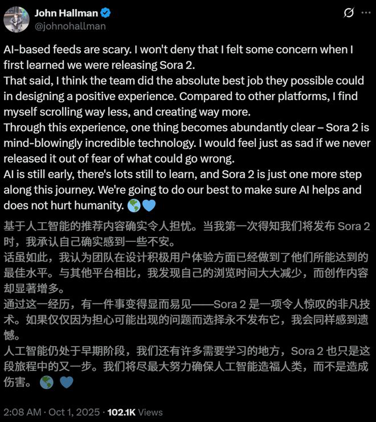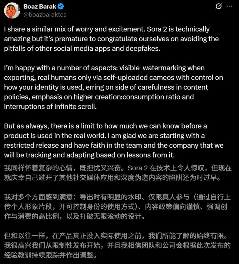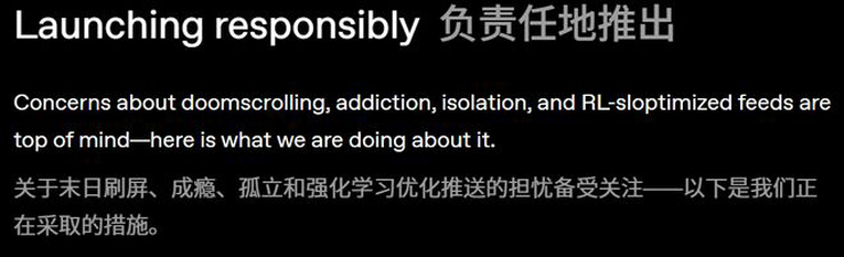 在官方博文中,他们列出了一长串担忧:信息茧房、成瘾、社交孤立、低质信息流……并郑重承诺,Sora的优化目标不是用户时长,而是「最大化创作行为」。