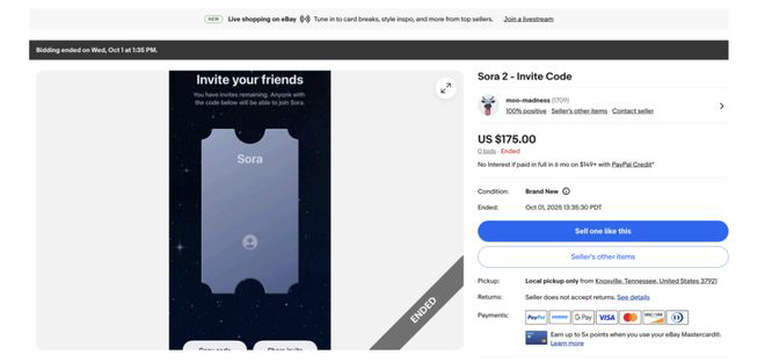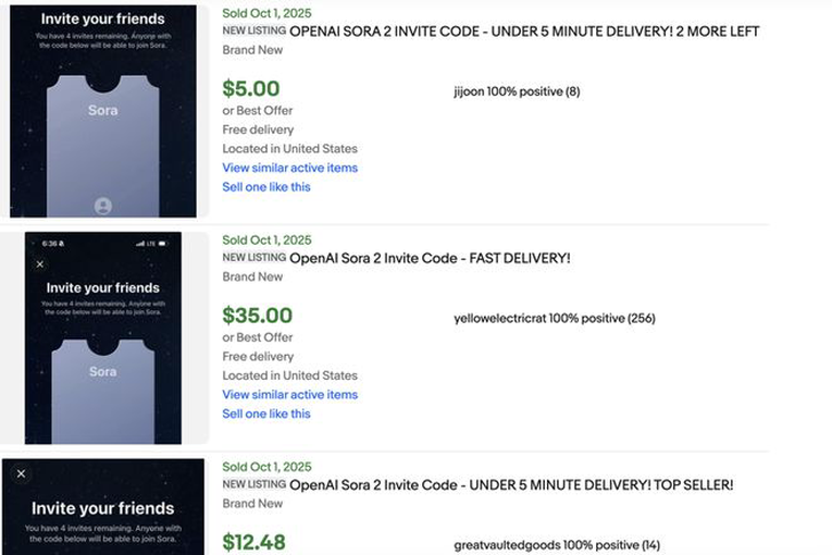 如今,在eBay这个全球最大的在线跳蚤市场上,一场围绕Sora邀请码的地下交易正在火热进行。