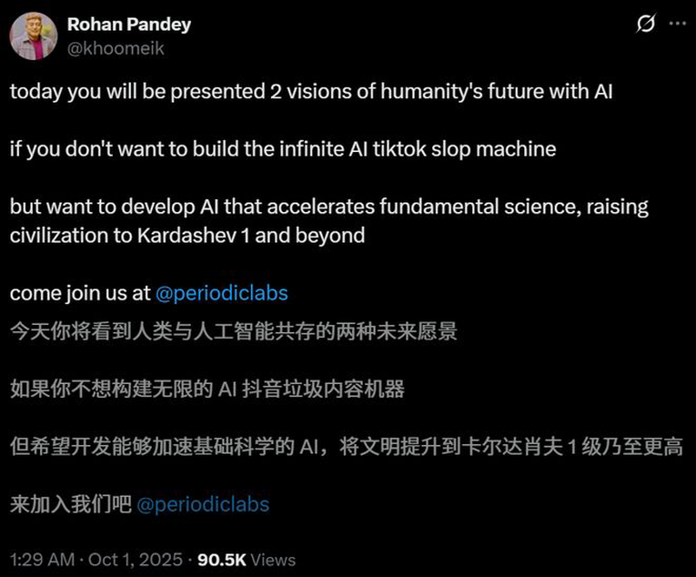 前OpenAI研究员Rohan Pandey,毫不掩饰地借机为自己的新公司Periodic Labs打广告。
