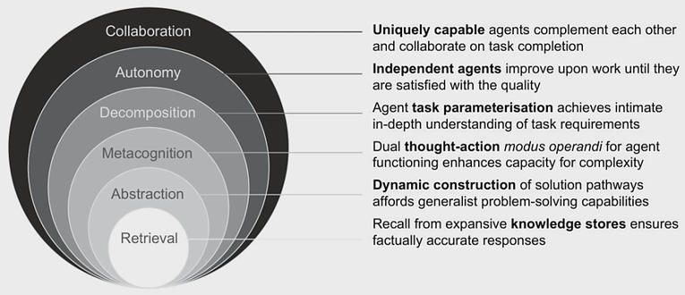 最外层是多智能体协作能力,不同功能的 AI 小助手组队,让系统做到文献检索、实验设计、数据分析专人专职。