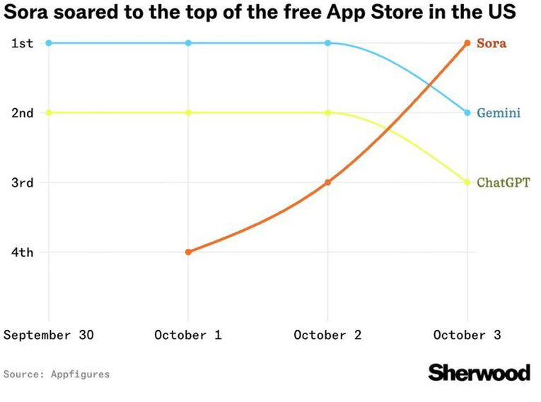 https://techcrunch.com/2025/10/03/openais-sora-soars-to-no-1-on-the-u-s-app-store/