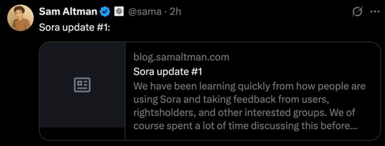 值得一提的是,奥特曼今早发博文预告,Sora下一次两大更新: