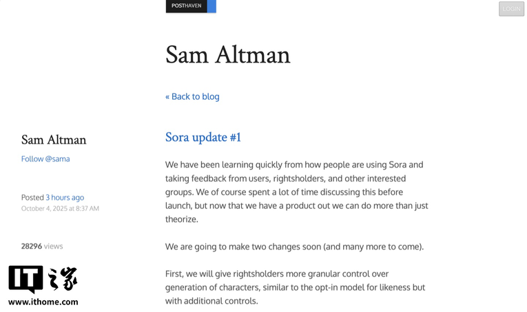 OpenAI CEO 奥尔特曼在博客中表示,OpenAI 将赋予权利方“更精细的角色生成控制”,同时电视和电影公司等版权方将能够选择屏蔽其角色在平台上的使用。