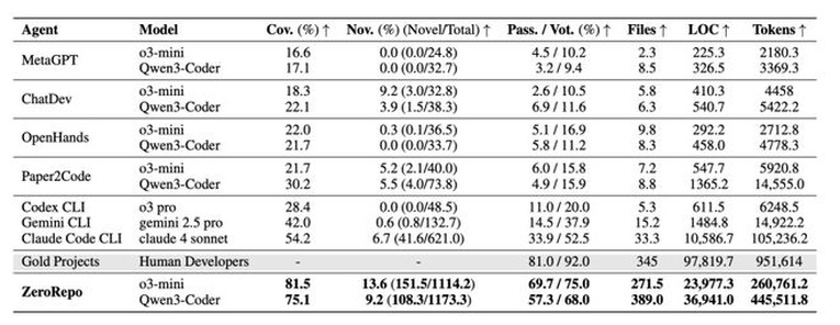 功能覆盖与规模:覆盖率达81.5%,比最强基线Claude Code高27.3个点;还能生成超100个新功能(创新率11–13%),远超其他方法。生成仓库平均36K行代码、445K tokens,是Claude Code的3.9倍、其他方法的64倍,复杂度接近人工项目。