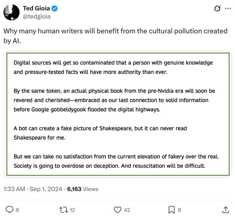 Ted Gioia,知名音乐评论家,也提出AI无法替代人类在创作中的深度思考与情感表达。