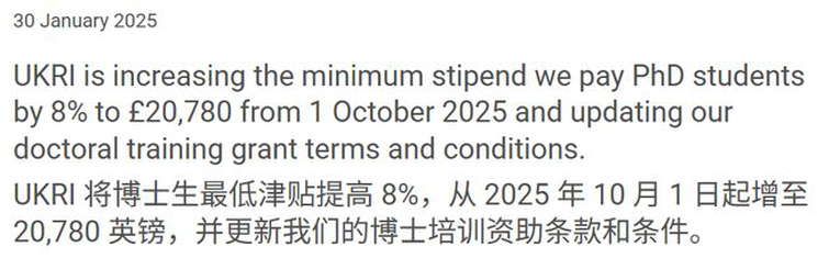在英国,UKRI也不得不出手,从2025年秋季开始,将最低博士生津贴提高8%,新标准为£20,780/年,试图更贴近生活成本。