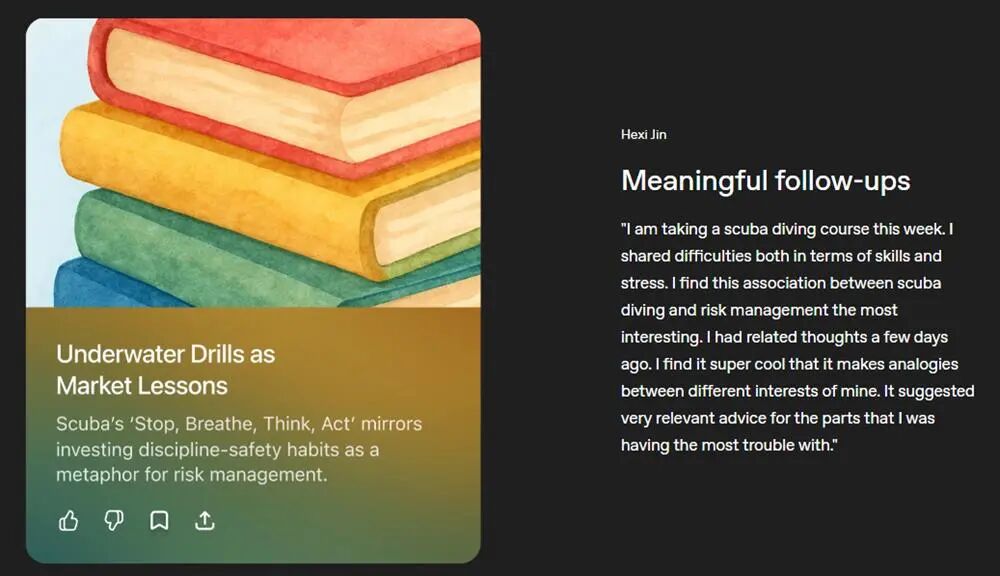 还有用户体验到了Pulse的“兴趣组合”能力。他回忆道:“它把我和它在不同对话里探讨过的两种计算机图形学技术结合了起来。一种是我艺术项目里用到的,另一种是我出于好奇学的。我从没想过要把这两者结合,但它的建议让我灵光一闪。我打算把这个想法实践出来,让我的艺术作品迈向一个新的维度。”