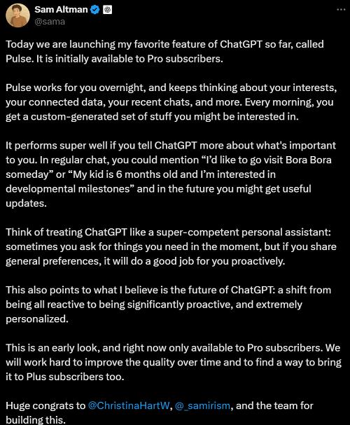 OpenAI创始人兼CEO Sam Altman发文称,Pulse是他目前最喜欢的ChatGPT功能,可以视为一个超级称职的私人助理,只要向它分享自己的偏好,就能主动为用户做好工作。这也是Altman眼中ChatGPT的未来——从完全被动转变为主动,并且高度个性化。