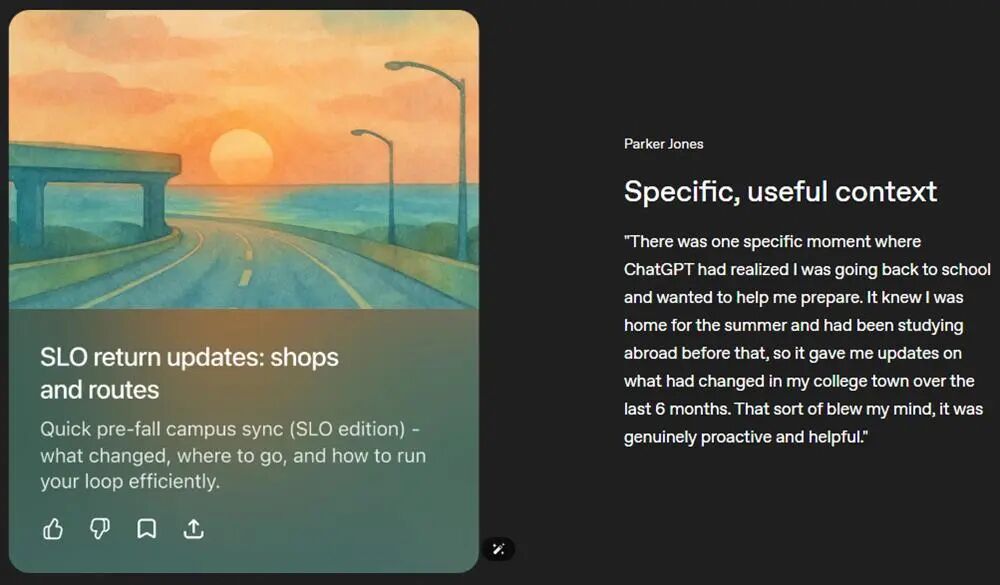 另一位用户则对Pulse的主动性印象深刻:“有一次ChatGPT意识到我即将返校,主动帮我准备。它知道我暑假在家,之前一直在国外学习,于是推送了过去半年里我大学所在城镇的变化。这让我大为震惊,它的主动性和实用性真的让我感到惊喜。”