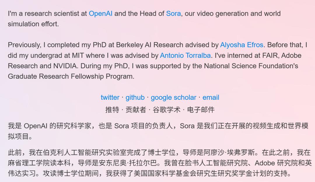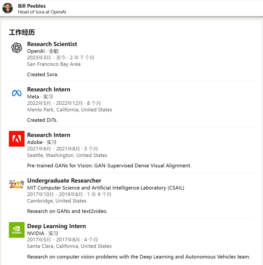 他曾先后在英伟达、Adobe、Meta的AI岗实习,博士毕业后直接加入了OpenAI,工作的最大业绩是Created Sora(创造出了Sora)。