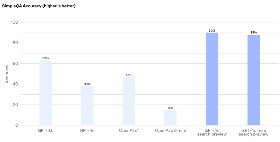 其中,“网络搜索工具”可让模型即时访问互联网信息,与驱动ChatGPT Search是相同模型提供支持。在SimpleQA(一个评估LLM在回答简短事实问题方面准确性的基准)上,GPT-4o和GPT-4o mini的得分分别为90%和88%。