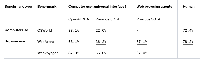 OpenAl表示,这项研究预览模型创造了新的最先进的记录,在OSWorld上实现了38.1%的完全计算机使用任务的成功率,在WebArena上实现了58.1%的成功率,在WebVoyager实现了87%的基于网络的交互成功率。